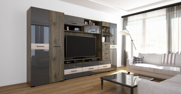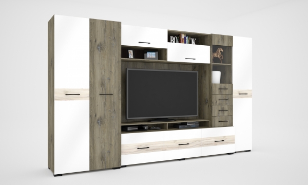 Karakteres, 345 cm-es méretben kapható Havanna szekrénysorunk 3-as színkombinációja különleges megjelenést kölcsönöz nappalijának. Szekrénysorunk sötét justus tölgy-magasfényű fehér-justus tölgy valamint sötét justus tölgy-magasfényű antracit-justus tölgy színben érhető el. A kiválóan pakolható részek, melyek akár plusz polcokkal is kiegészíthetőek, valamint a TV számára kialakított 165 cm hosszú rész, egyaránt a praktikusságot bizonyítják.