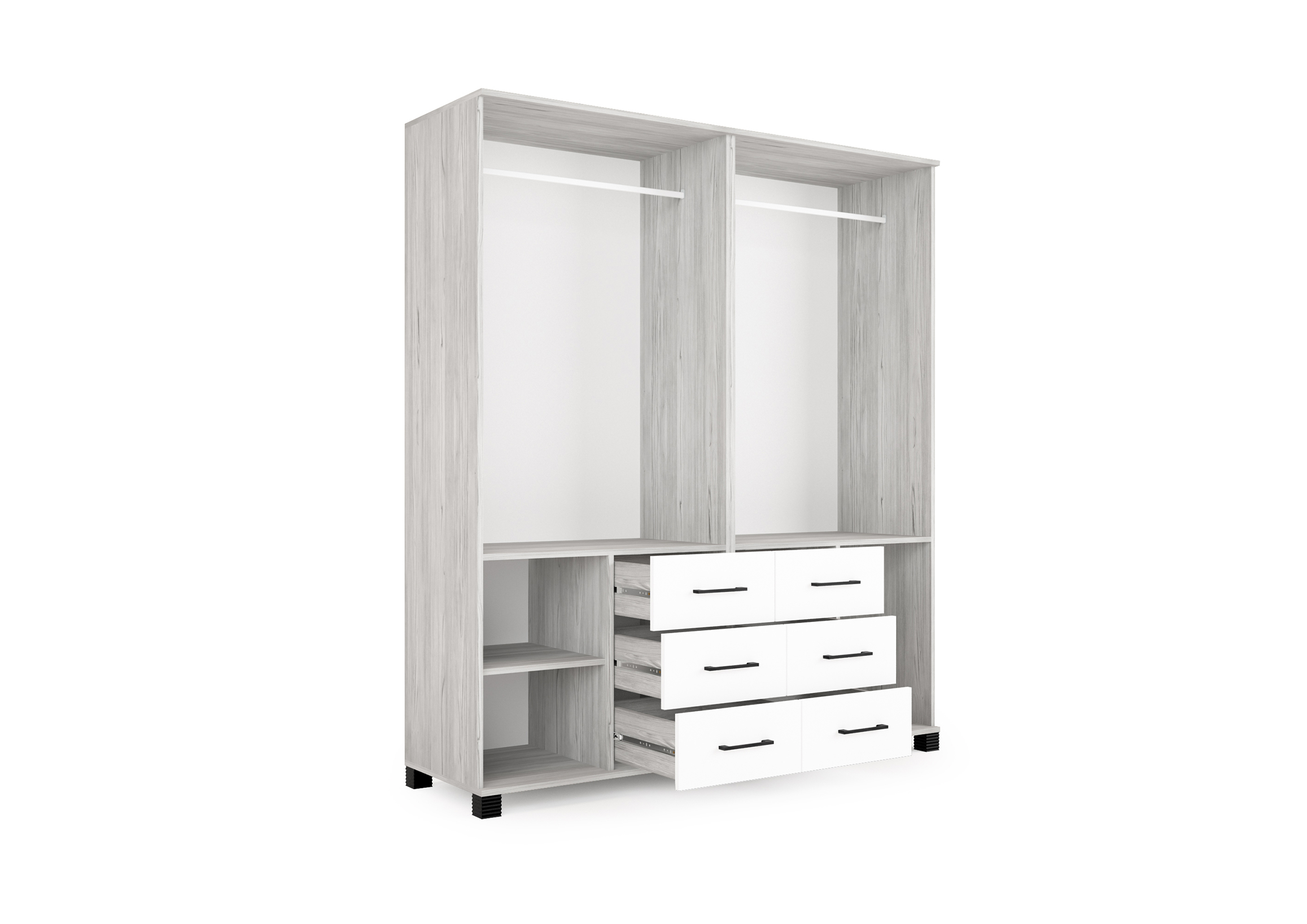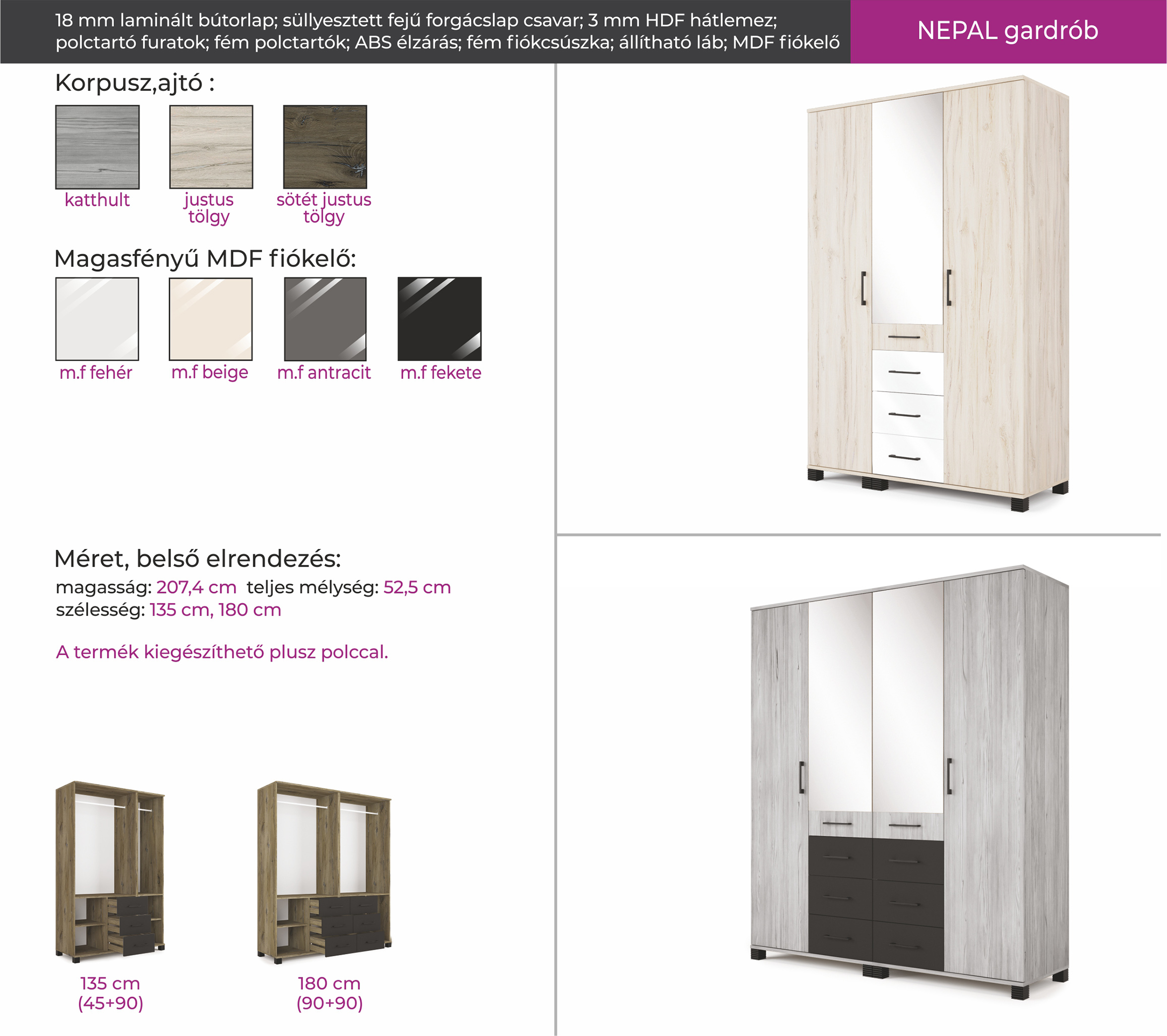 A Nepal gardrób 3 féle korpusz-ajtó színben kérhető. Ehhez szabadon választható 4 féle magasfényű fiókelő szín, így saját ízlésünknek megfelelően állíthatjuk össze gardróbunkat. Belső elrendezését tekintve mándlirudas, polcos-fiókos részekből áll, így kiválóan pakolható, legyen szó a 135 cm-es vagy 180 cm-es méretről.