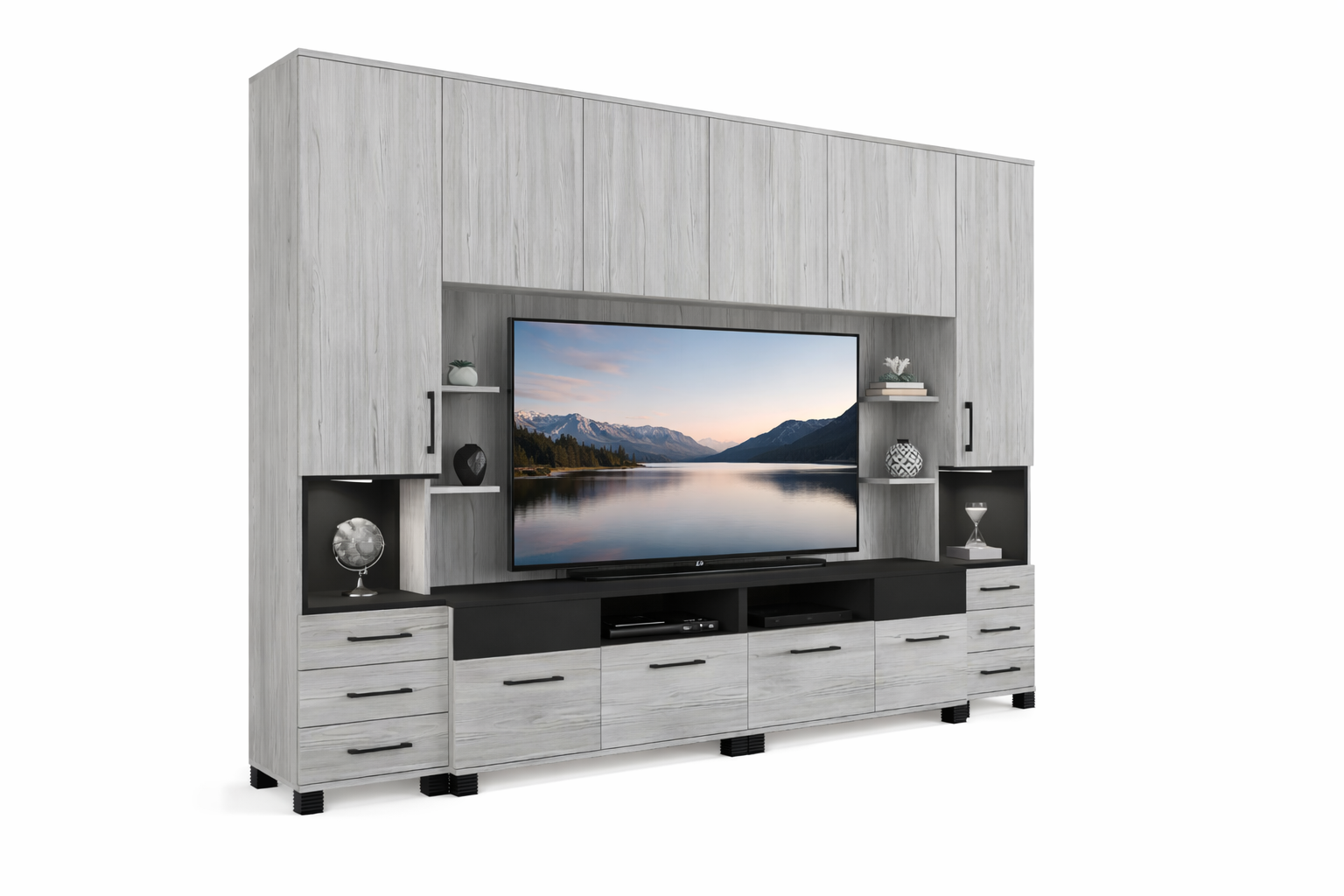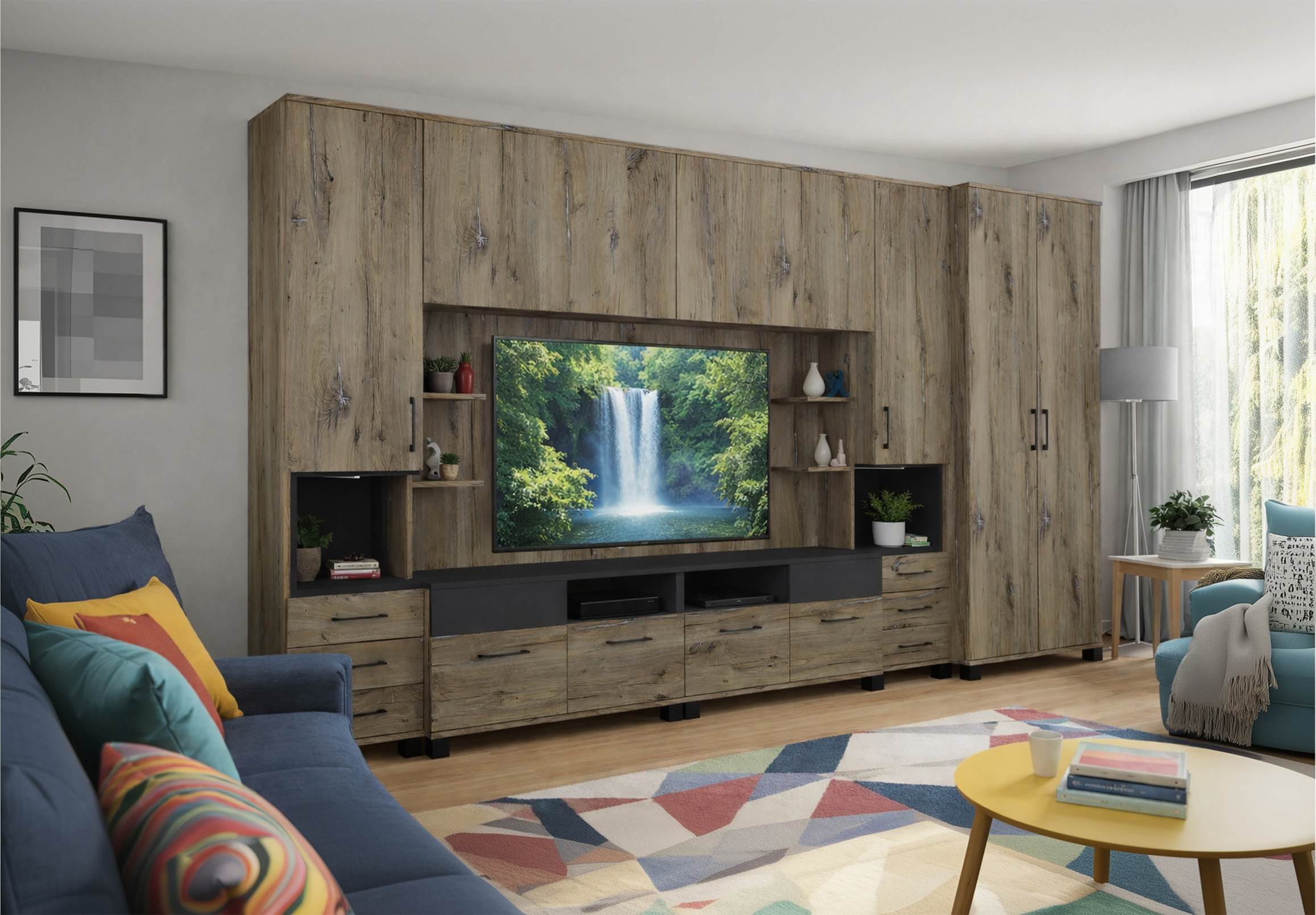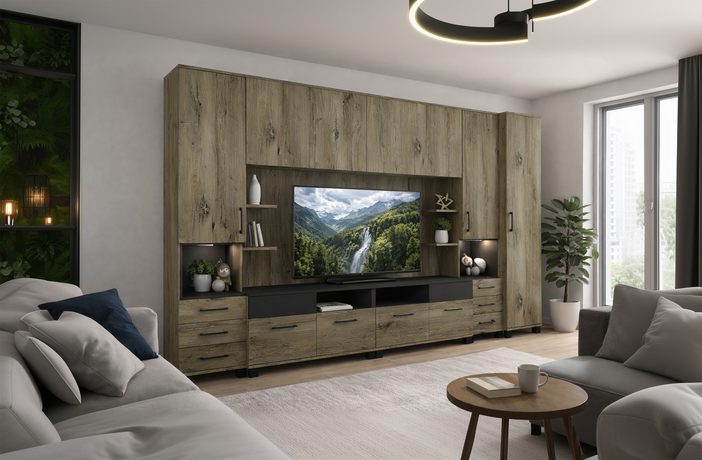 Modern nappali szekrénysor praktikus tárolóhelyekkel, fiókokkal és polcokkal. A letisztult design könnyen illeszkedik a mai lakberendezési stílusokhoz. A bútor áthidalós változatban is rendelhető, amelynél a középső tévés rész helyére ágy helyezhető, így ideális választás kisebb lakásokba, vendégszobába vagy multifunkcionális nappaliba.