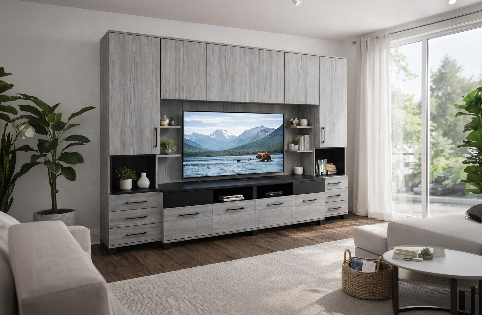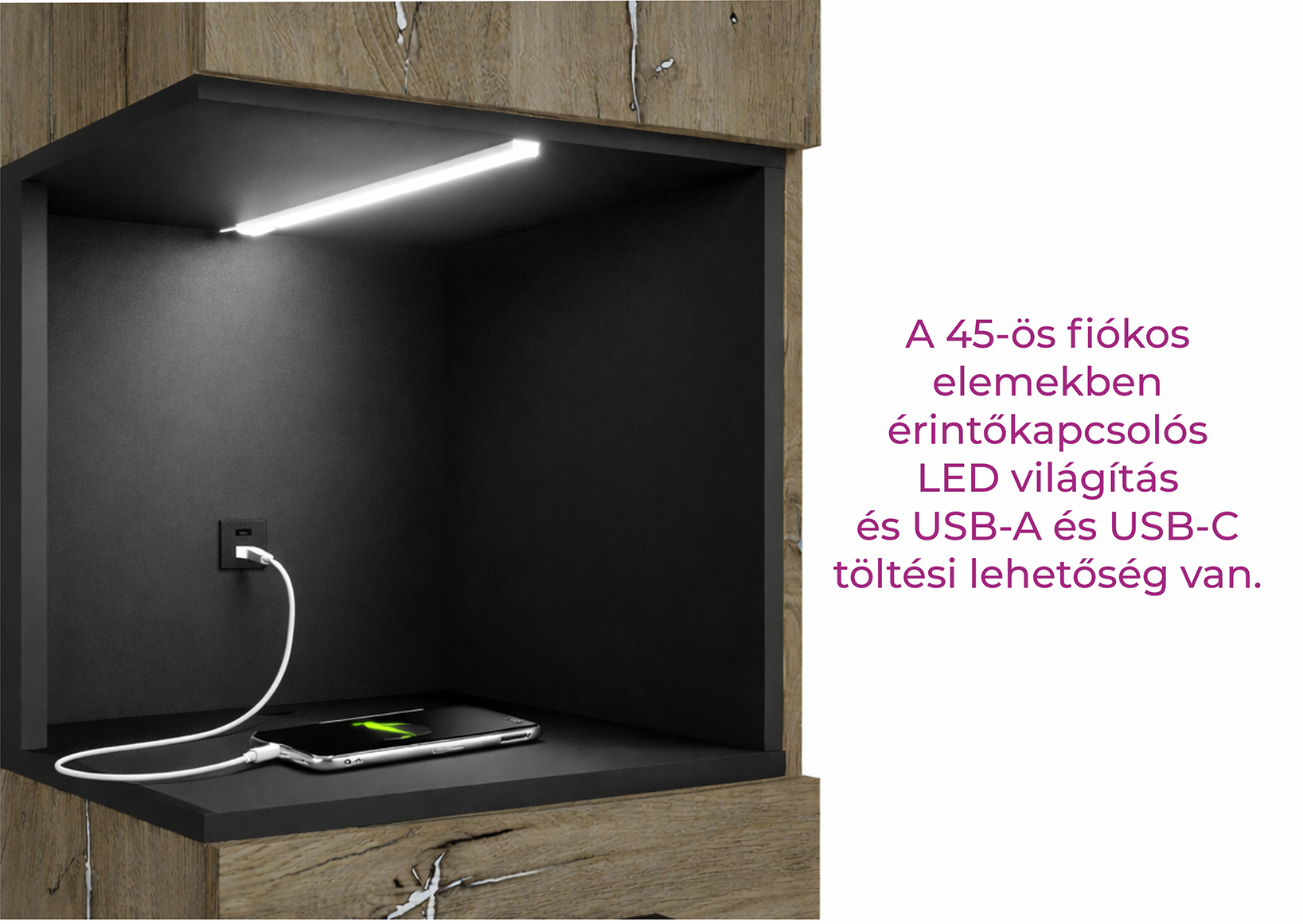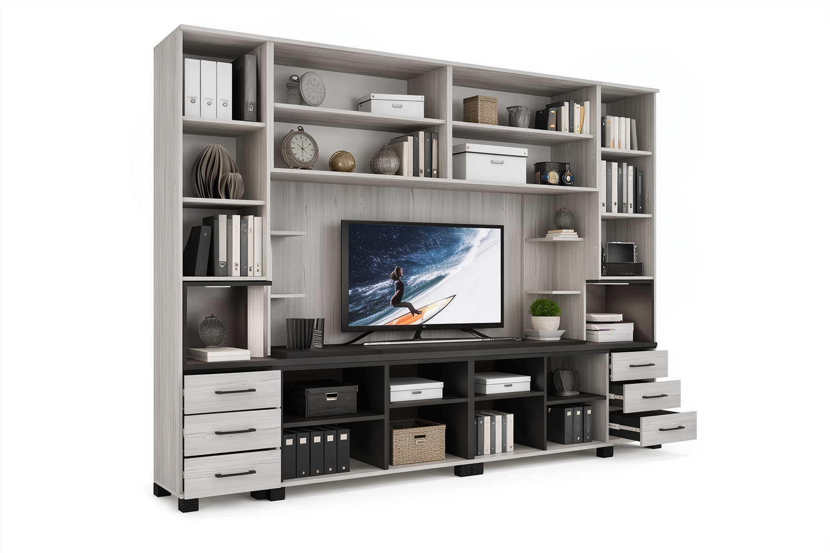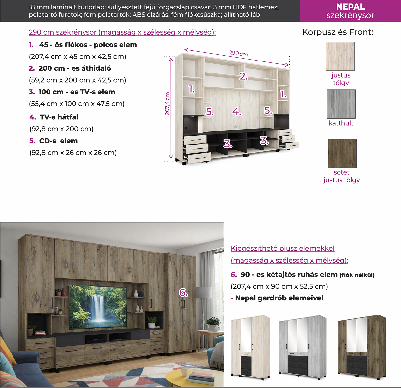 Modern nappali szekrénysor praktikus tárolóhelyekkel, fiókokkal és polcokkal. A letisztult design könnyen illeszkedik a mai lakberendezési stílusokhoz. A bútor áthidalós változatban is rendelhető, amelynél a középső tévés rész helyére ágy helyezhető, így ideális választás kisebb lakásokba, vendégszobába vagy multifunkcionális nappaliba.