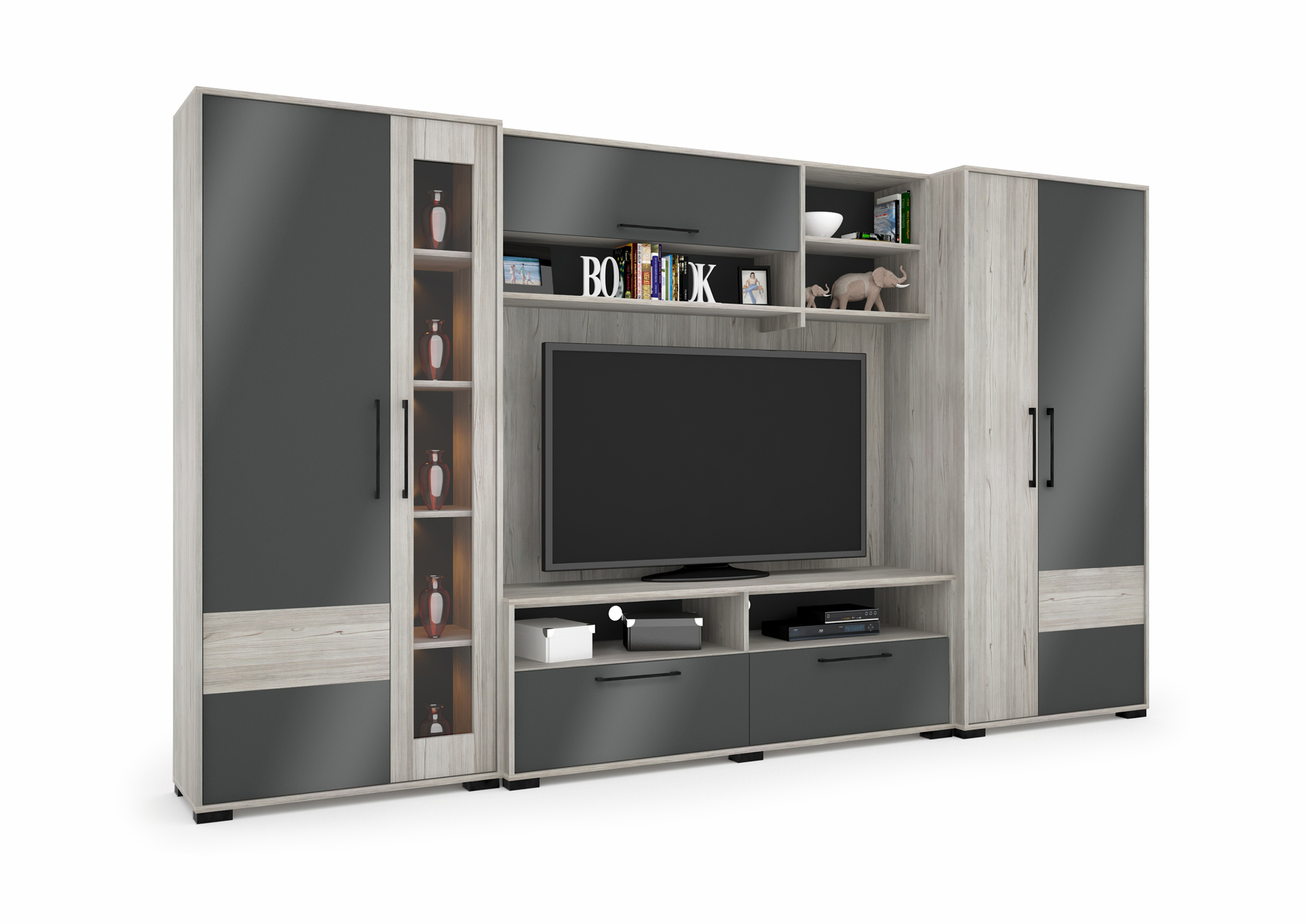 Modern forma és színvilág. Nova szekrénysorunk katthult-magasfényű antracit, illetve katthult-magasfényű fehér színkombinációban kapható. Üveges elemébe opcionálisan LED világítás is rendelhető. Polcos és akasztós elemei további polcokkal egészíthetőek ki.