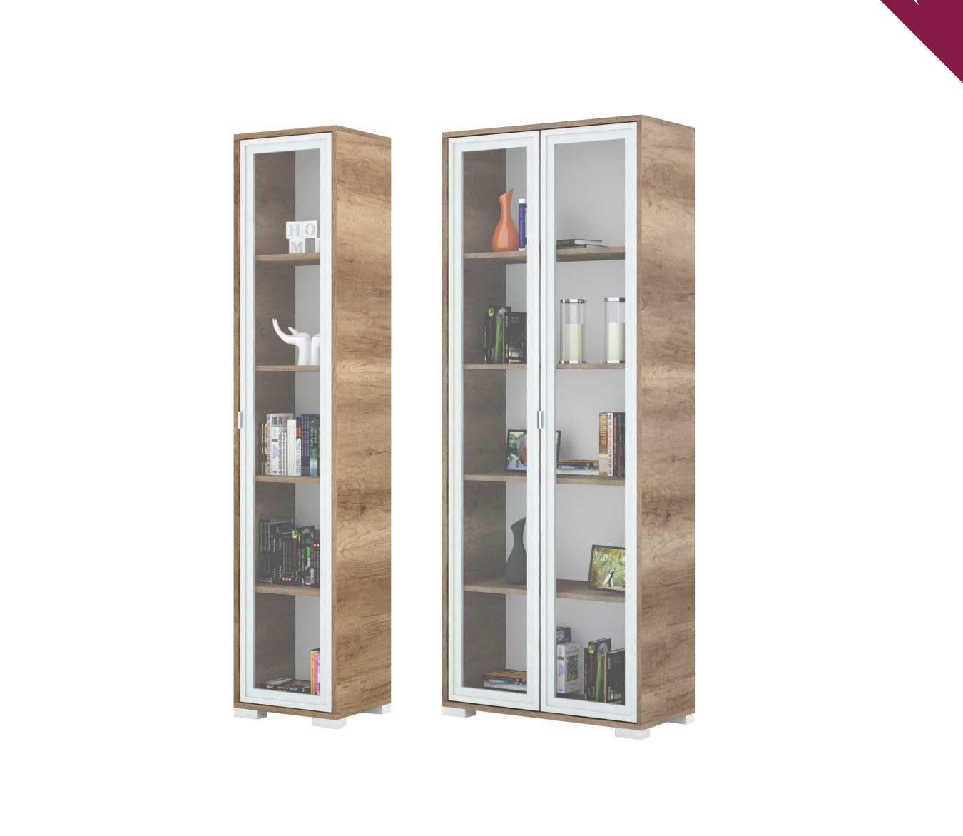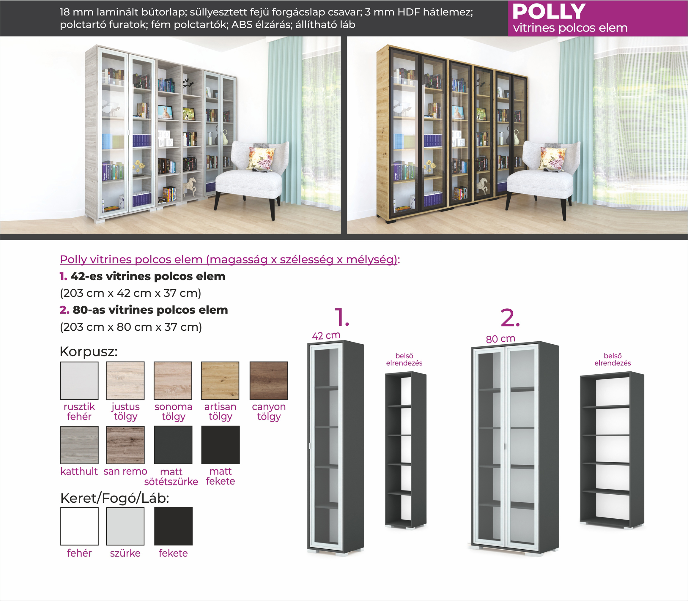 Polly vitrines polcos elemeink egyaránt jól mutatnak nappalikban, étkezőkben. Két méretben kapható, 42 és 80 cm-es kivitelben, melyek segítségével hangulatos sarkokat alakíthatunk ki otthonunkban. Elérhető színek:  rusztik fehér, katthult, sonoma tölgy, artisan tölgy, san remo, canyon tölgy, matt sötétszürke, matt fekete.